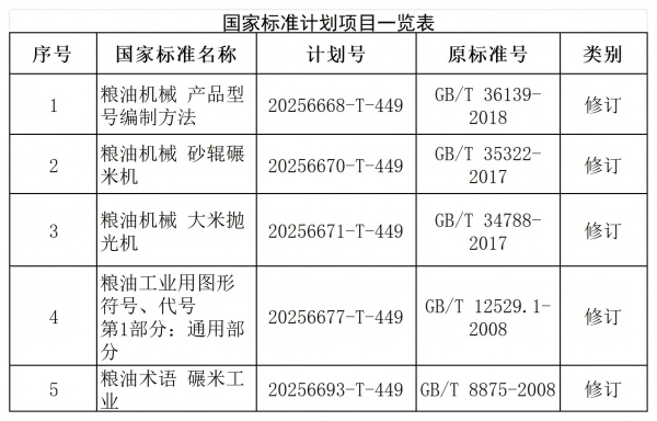 全国粮油标准化技术委员会归口的《粮油术语 碾米工业》等5项国家标准修订项目已于2025年12月2日由国家标准化管理委员会批准立项,项目周期16个月,第一起草单位为国粮武汉科学研究设计院有限公司。为广泛吸收各利益相关方参与,充分依托各方资源推进标准修订工作,现公开征集标准起草单位和专家。有关事项通知如下: